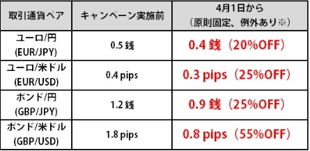 ドル円をはじめとした現行の1万通貨から8つが1000通貨に引き下げられます。(ランド円及びメキシコペソ円は1万通貨)