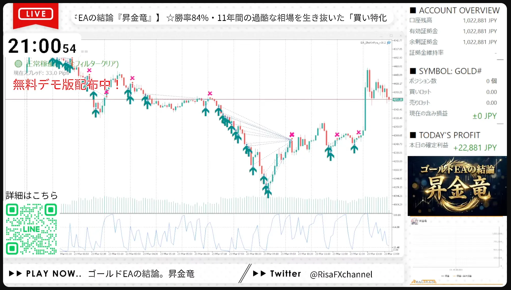【本日の利益+22,881円】11年無敗のゴールド専用EA『昇金竜』/完全無料デモ版で今すぐあなたのMT5へ!
