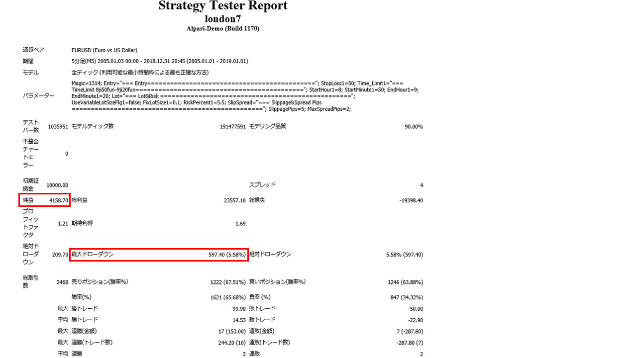 一回の取引における最大ストップロスの初期設定は50pipsですが、期間中の総取引数2468回のうち67回、年に5回もない計算になります。