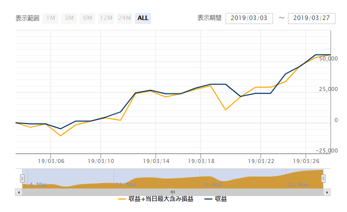 日毎に見てみるとマイナスになる日もありますが、概ね安定して利益を出しています。