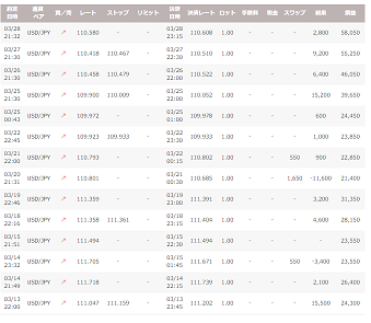 スワップポイントを見てみましょう。今年の3月13日からのフォワードの一覧ですが、スワップポイントの利益が掲載されています。14日と21日に550円、3月20日に1650円を獲得しています。