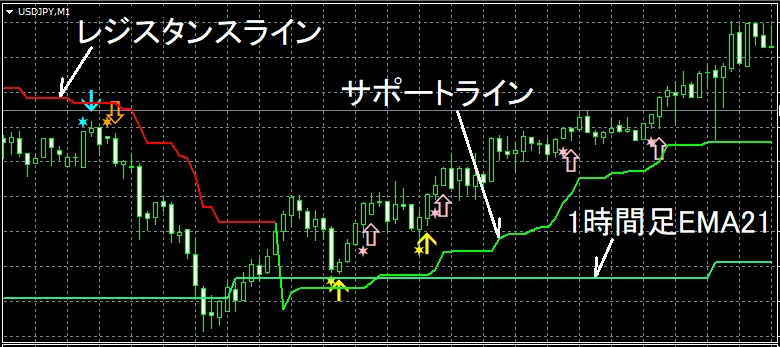 【スーパートレンドRCIで勝つ!!】ドル円 1分足 1時間足EMA21とSTRCIのサイン
