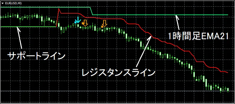 【スーパートレンドRCIで勝つ!!】ユーロドル 1分足 1時間足EMA21とSTRCIのサイン