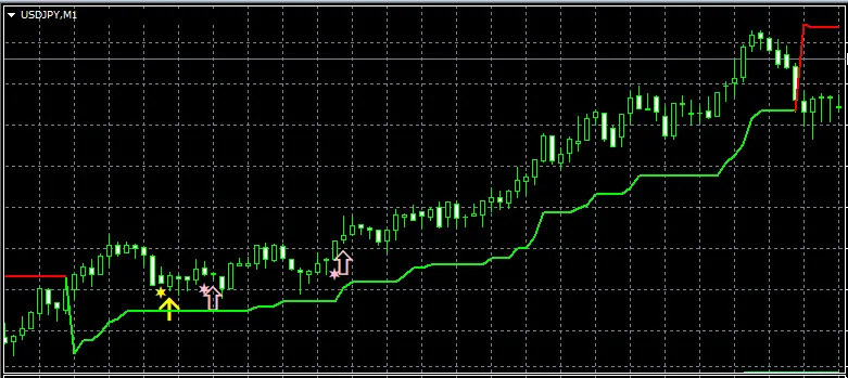 上のチャートでは、スーパートレンドのレジスタンスラインを上抜けした後の上昇過程で、【STRCI】のサインが数回タイミングよく点灯しています。