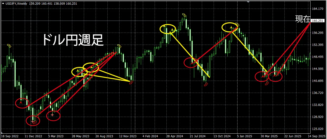 ドル円週足を見返すと、スイングレベルでもことごとく天井と底を捉えていますね。