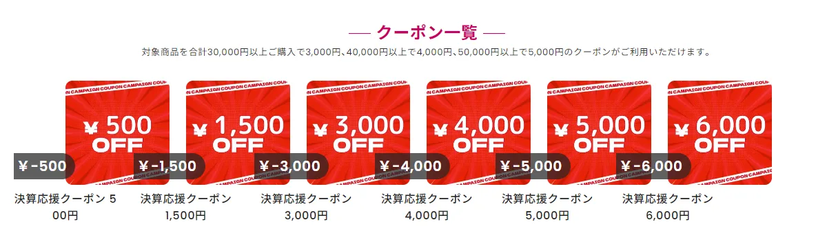 - 3,000円クーポン:対象商品の合計 3万円以上