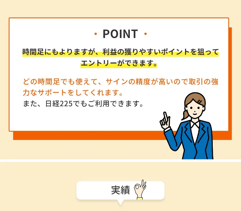 どの時間足でも使えて、サインの精度が高いので取引の強力なサポートをしてくれます。 また、日経225でもご利用できます。