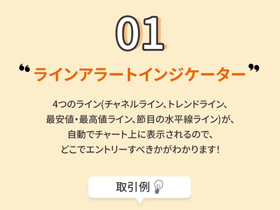 4つのライン(チャネルライン、トレンドライン、最安値・最高値ライン、節目の水平線ライン)が、自動でチャート上に表示され、どこでエントリーすべきかがわかります!