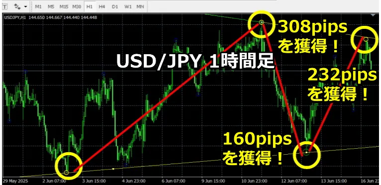 売りサインと買いサインで利確し、1回で最大590pipsを獲得しました!