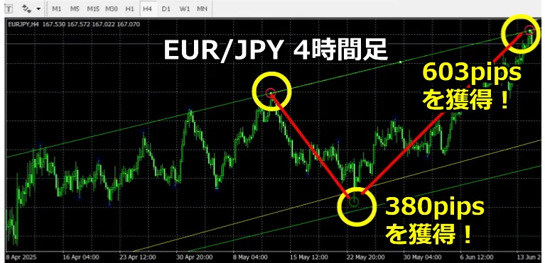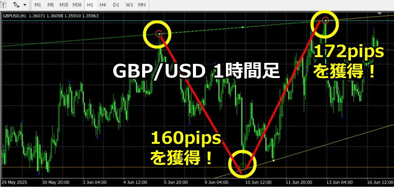 売りサインと買いサインで利確し、1回で最大525pipsを獲得しました!