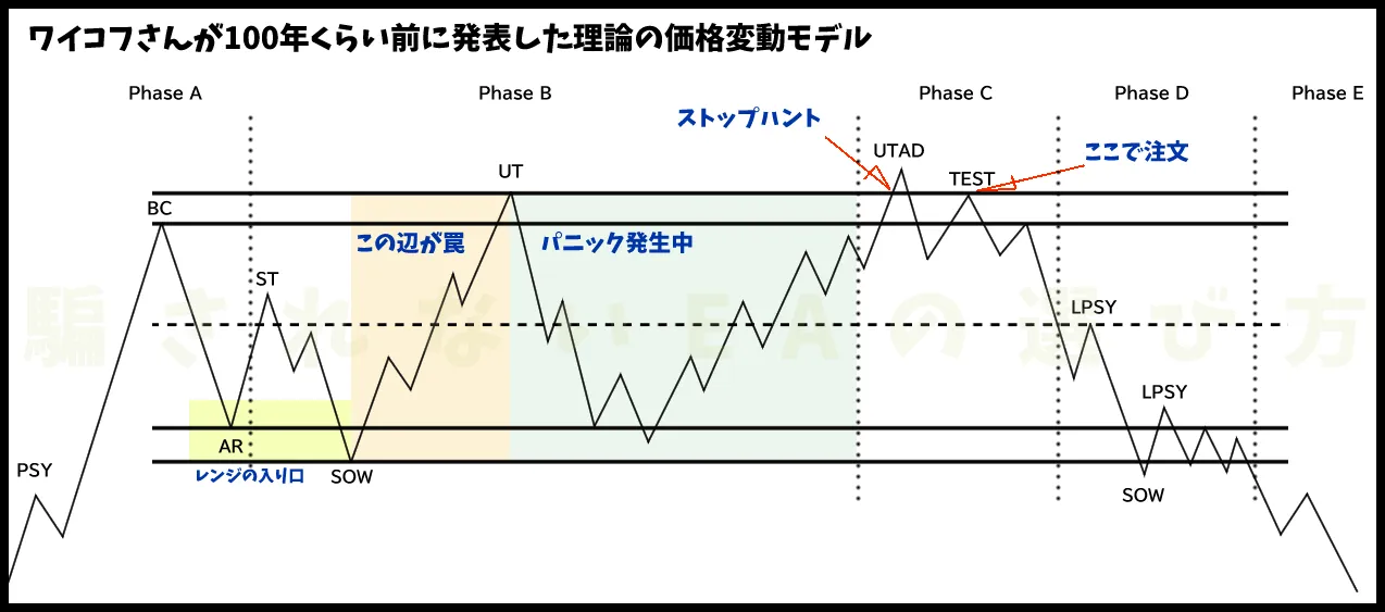 「騙されないEAの選び方 資金の守り方」という本を書きました。こちらの詳細ページでEMAを使った簡単な手法と、さきほどのワイコフパターンのインジケーターの一次情報だけをつかったトレード方法を実際のチャートを見本にして紹介しています。よろしければどーぞ!