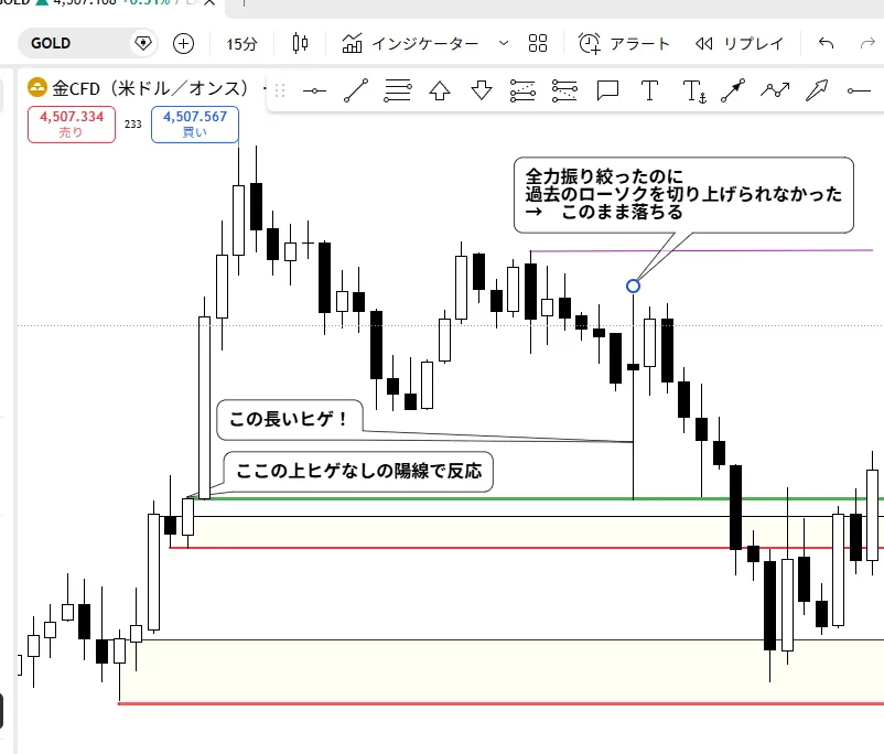 途中で大きな長いひげを作って一気に買いの上昇をみせたけど、抜けきれず。