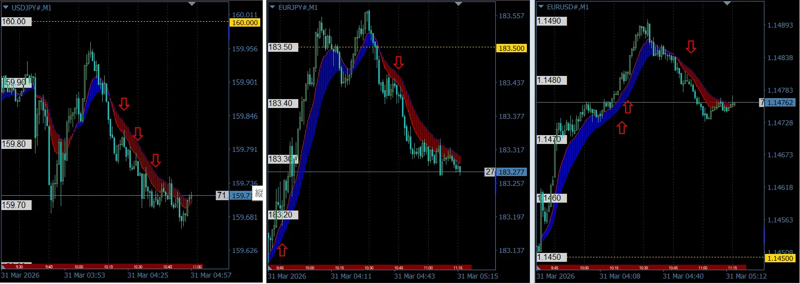 [26.3.31]手法による、ドル円、ユーロドル、ユーロ円のエントリーポイントで+10pips