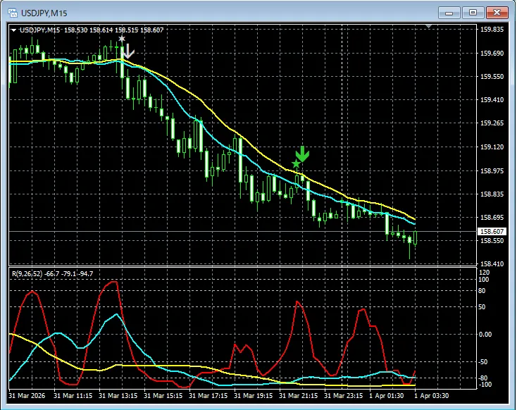 【RCIを極めて勝つ!!】mBDSR(移動平均線フィルター)とR1R2S2のサインの両方を活用する(50) 直近のドル円15分足から