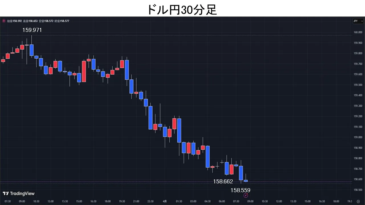 東京時間、ドル円は四半期末に絡んだ本邦実需勢のドル買い観測などで、一時159.97円まで上昇。しかし、「トランプ米大統領はホルムズ海峡封鎖解除がなくても戦争終結の準備をしている」とWSJ紙が報じると、ドル円は159.49円まで下押し。欧州時間、トランプ米大統領の発言を受け、米国とイランの紛争終結期待が高まり、「有事のドル買い」を巻き戻す動きが広がった。NY時間、月末・期末のロンドン・フィキシング(日本時間24時)で円買いのフローが観測されると、前日の安値159.33円を下抜けて一時158.90円まで下落。その後、「ペゼシュキアン・イラン大統領は『保証があれば戦争を終わらせる準備ができている』との考えを示した」との報道をきっかけに、原油安・株高・ドル安の流れが強まり、ドル円は158.66円まで下落。