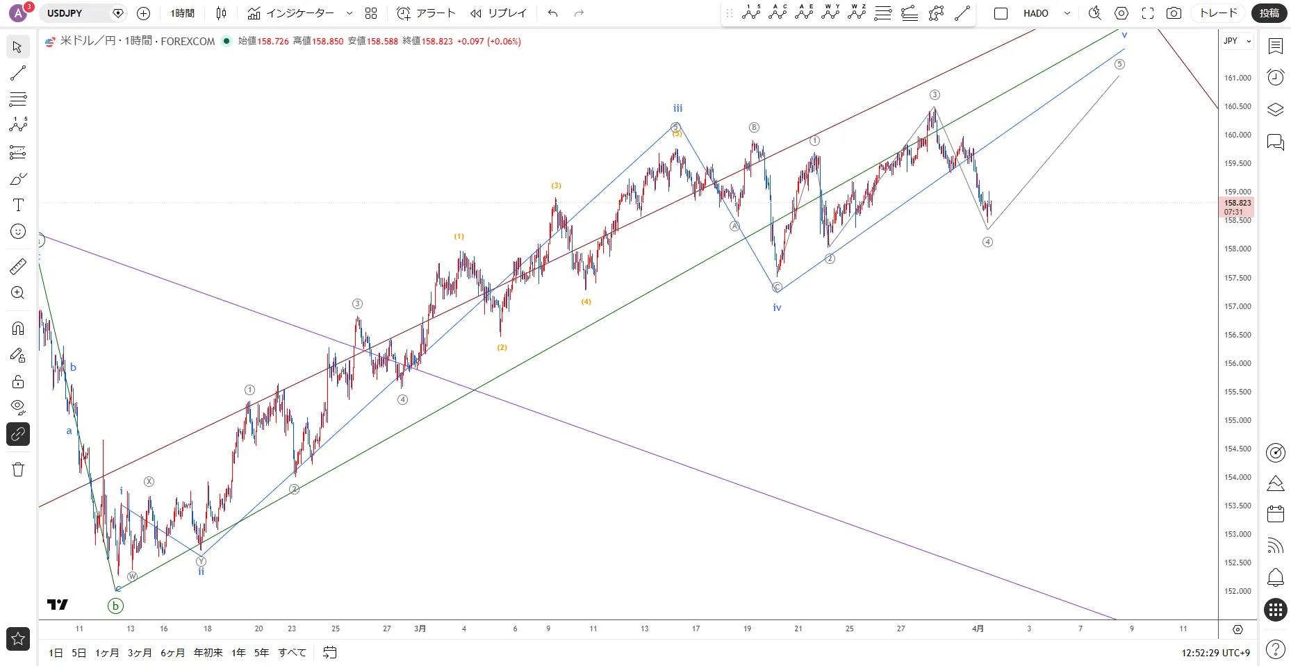 【ドル円】下げ止まりのメド到達 / 4月1日(水)のイベントエリオット波動分析