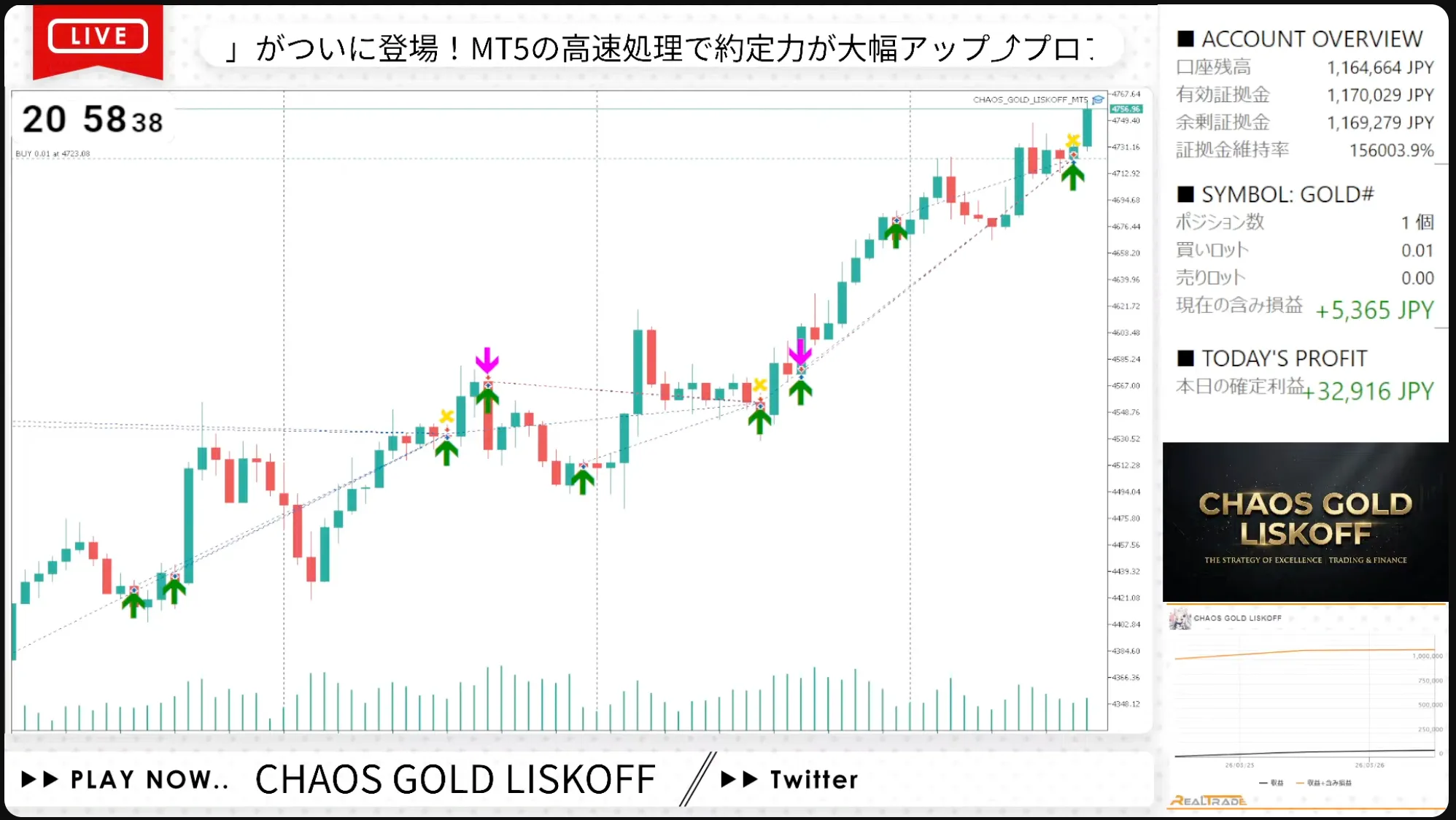 CHAOS_GOLD_LISKOFF_MT5は本日+32,916円を確定しました。20時58分時点で1ポジション保有中、含み益は+5,365円となっています。証拠金維持率156,003.9%と、極めて余裕のある資金状態です。口座残高は1,164,664円(昨日:1,131,748円)。