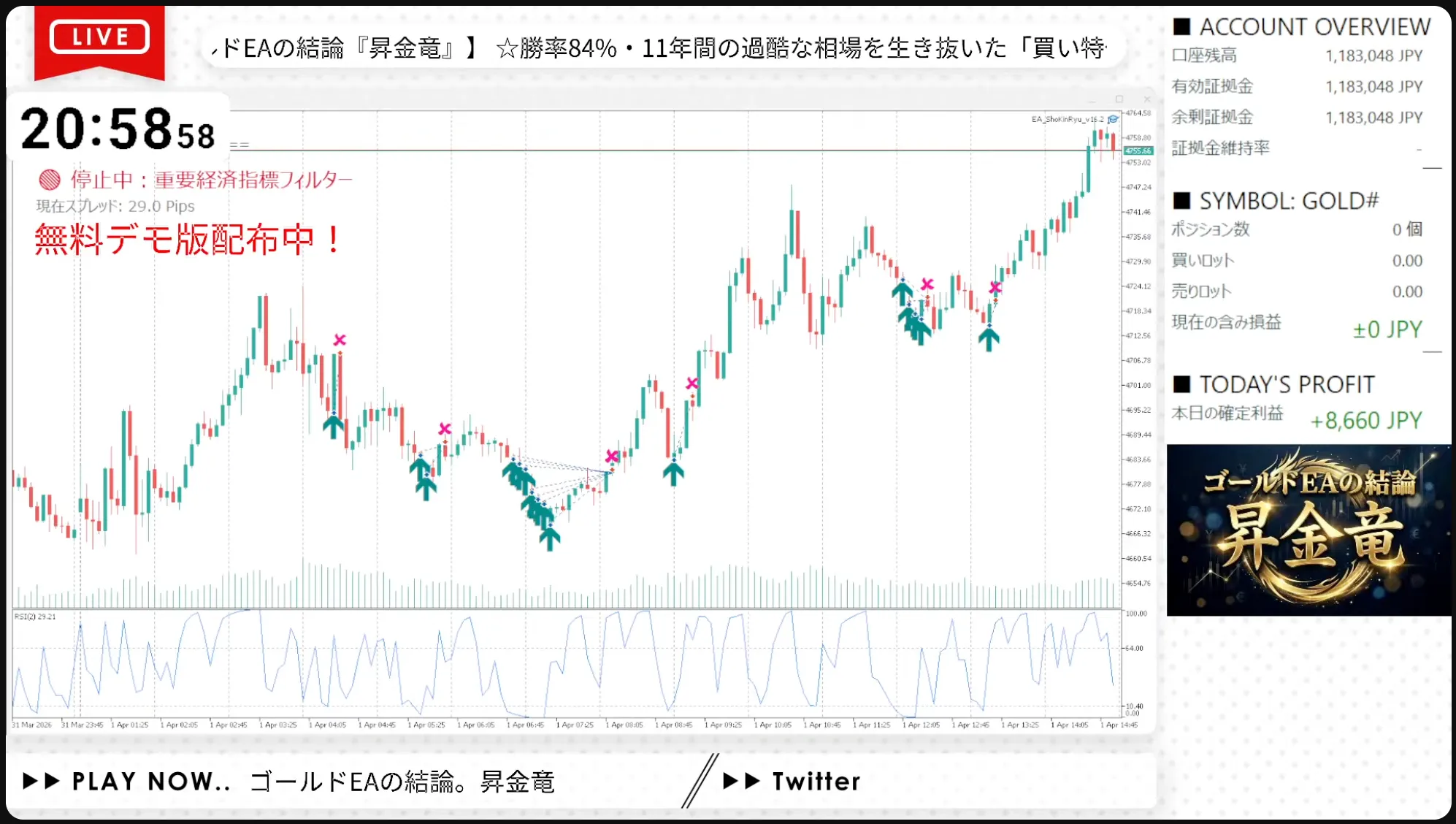 昇金竜は指標前のニュースフィルターを使って安全にリスクを回避しながら+8,660円、CHAOS_GOLDはアノマリー手法で+32,916円と役割分担がはっきりした一日でした。2本のEAが異なるアプローチで補完し合うことで、相場局面に依存しない安定した運用ができています。