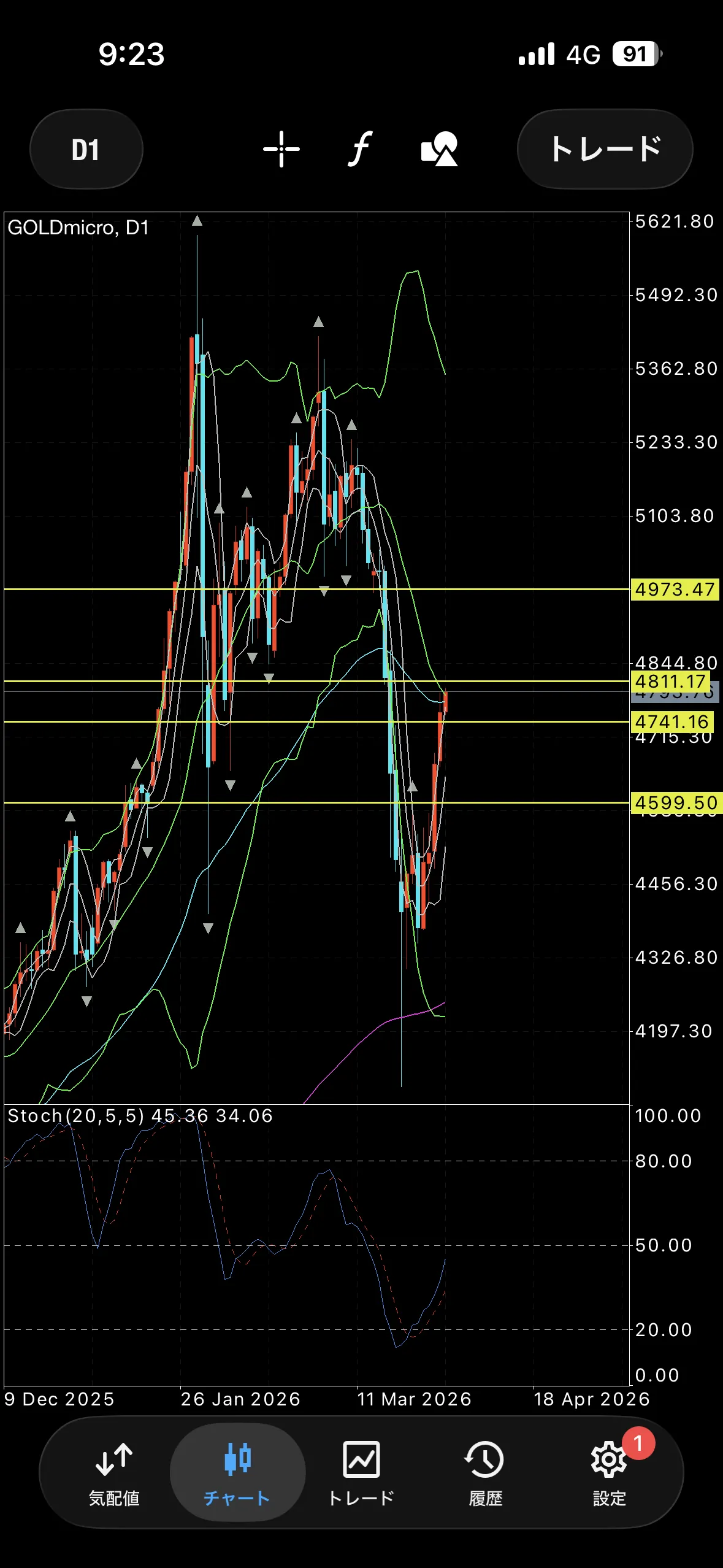 ミドルに当たっているため、この辺りの値動きには注意が必要です。