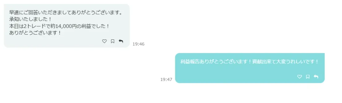 「本日は2トレードで約14,000円の利益でした!ありがとうございます!」