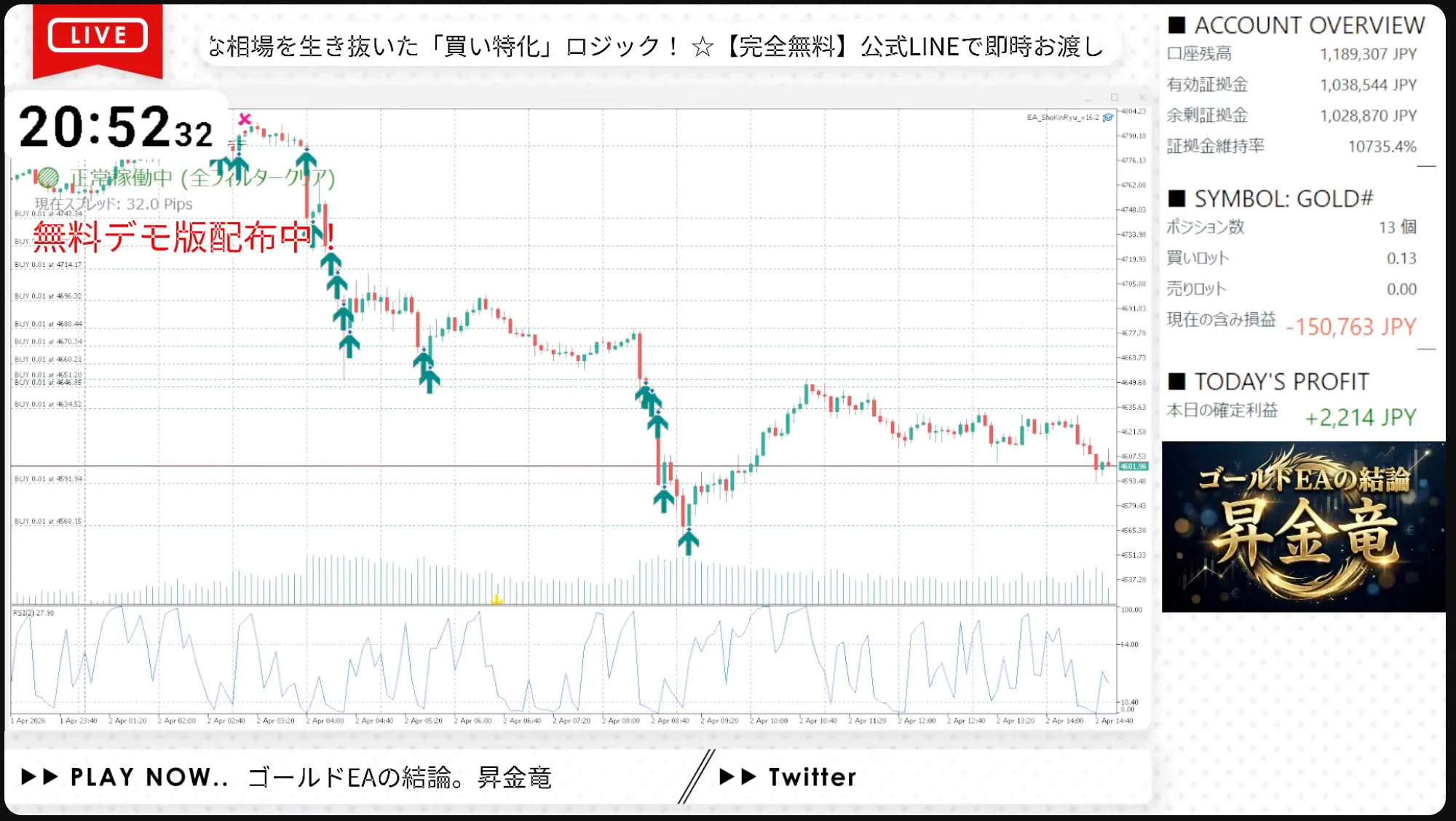 昇金竜にとっては、上昇から急落への転換が厳しい局面となりました。買い専用スキャルピングEAの性質上、急落過程で複数のナンピンポジションを積み上げており、20時52分時点で13ポジション・含み損-150,763円を抱えています。ただし証拠金維持率は10,735%を維持しており、資金的には十分な余裕があります。