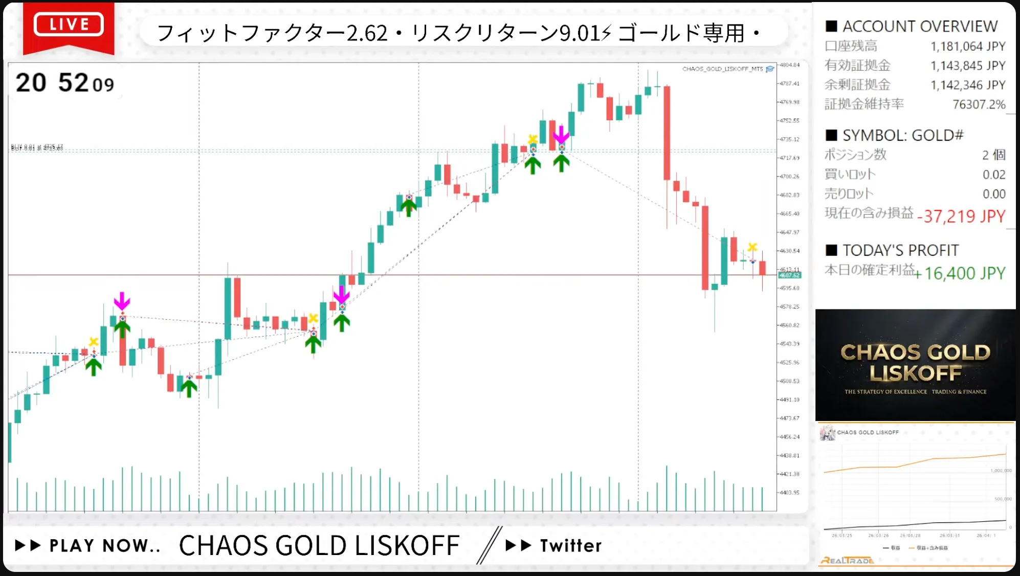 CHAOS_GOLD_LISKOFF_MT5は本日+16,400円を確定しました。木曜日は定休日(新規エントリーなし)のため、昨日(水曜)から持ち越した2ポジションが現在-37,219円の含み損を抱えています。証拠金維持率76,307.2%と資金的な余裕は十分にあります。