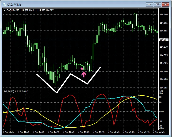 【RCIを極めて勝つ!!】カナダドル円 5分足 ダブルボトムとmBDSRのサイン