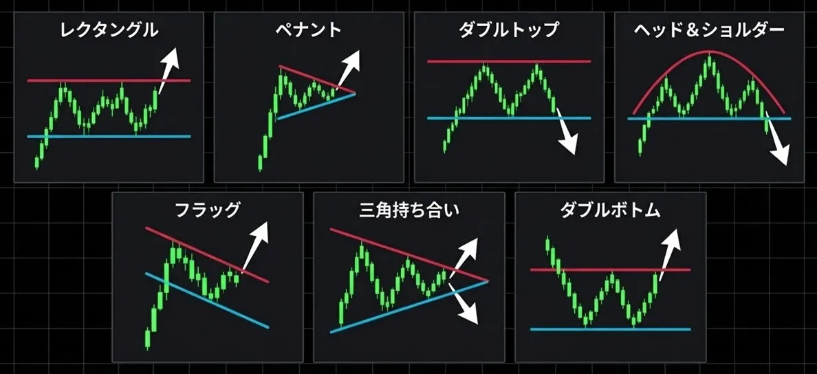 ダブルトップ / ダブルボトム、ヘッド&ショルダー、三角持ち合い、レクタングル、フラッグ / ペナント