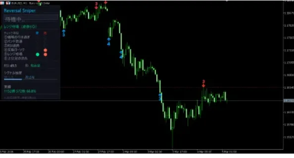 Reversal Sniperは、ローソク足のパターンとモメンタムの変化から「反転の兆し」を検出してサインを出す。ゾーン内でこのサインが出れば、「場所」と「タイミング」の両方が揃ったことになる。