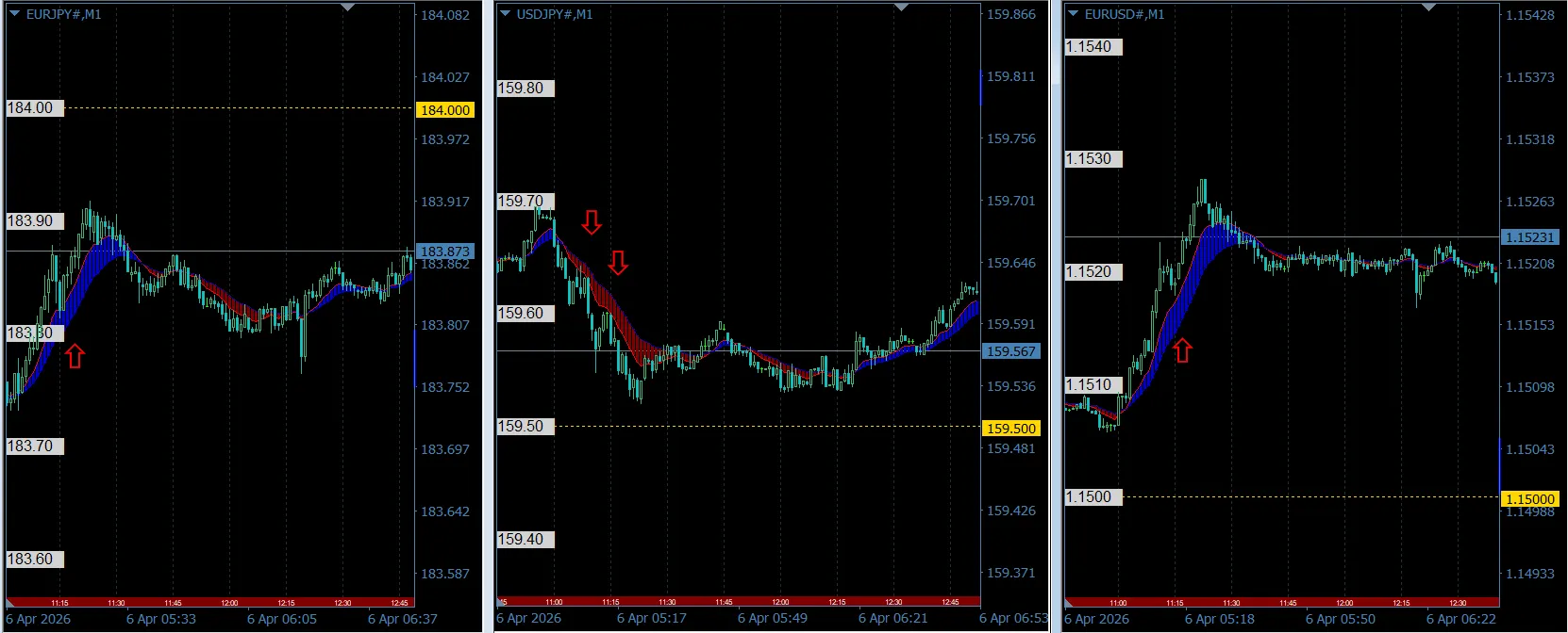 [26.4.6]ドル円、ユーロ円、ユーロドル、エントリーポイント、同じ動きを狙って+10pips