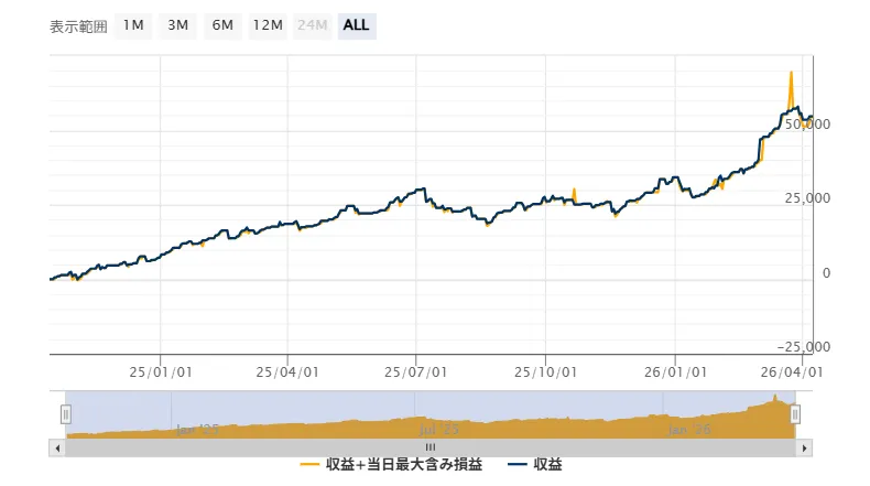 ? 2025年3月12日よりスタート。わずか約1年で累計75万円超の収益を達成。最高峰では初期資金の約1.75倍に到達するという驚異的な成績を記録しています。