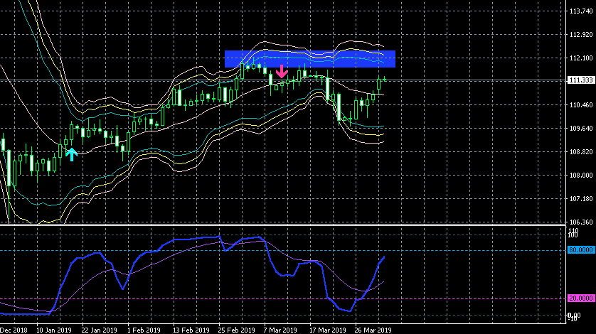 しかし、大きな上値抵抗が112円付近(画像の青帯)にあるのと、まだ上値を切り下げる形から完全に脱しているわけではないため、買いは慎重に入る必要があります。