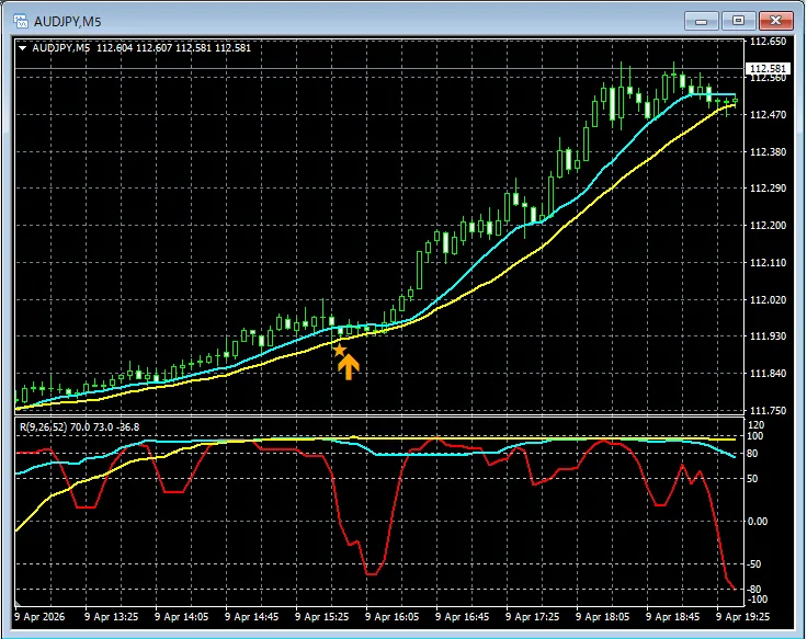 【RCIを極めて移動平均線フィルターで勝つ!!】昨日の 豪ドル円 5分足 mBDSRのサイン