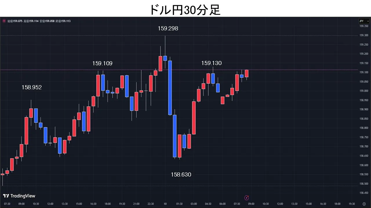 東京時間、ドル円は東京仲値に向けたドル買いが先行し、一時は158.95円まで上昇。しかし、4/11に予定されている米国とイランの和平交渉に関しては不透明感も根強く、積極的に上値を試す動きにはならなかった。欧州時間、米国とイランが2週間の停戦で合意したが、その後もイスラエルがレバノンへの攻撃を続けていることにイランが強く反発。協議進展への期待感が後退し、原油先物価格が急伸すると、為替市場では「有事のドル買い」が先行し、ドル円は一時159.29円まで上昇。NY時間、ネタニヤフ・イスラエル首相が「イスラエルはレバノンと直接交渉することに合意した」と表明、「レバノンはイスラエルとの交渉のため一時停戦を要請」との報道が伝わると、原油先物価格が下落、安く始まった米国株が上昇、為替市場では「有事のドル買い」を巻き戻す動きが広がり、ドル円は158.63円まで下落。また、ネタニヤフ・イスラエル首相が「レバノンの親イラン組織ヒズボラへの強力な攻撃は継続する」と述べ、「レバノンにおいて停戦はない」と強硬な姿勢を改めて示すと再びドル買いが先行し、ドル円は159.13円まで上昇。