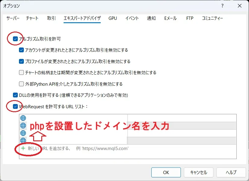 MT4 MT5のツール→オプションから、ウェブリクエストを許可して、phpの設置したドメインを登録(https~入力 ×http:// 必ずhttps://にしてください)