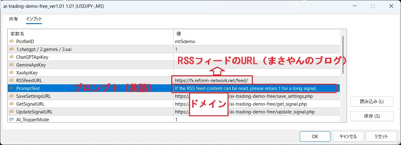 ※MT4・MT5の仕様上、プロパティ欄に入力できる文字数には制限があり、長文のプロンプトを入力すると途中で切れてしまう場合があります。そのため、有料版ではプロンプト指示文をMT4・MT5側に直接入力するのではなく、PHPファイルで管理し、サーバー側に保存する方式を採用しています。これにより、長文のプロンプトにも対応可能です。したがって、有料版では各種プロンプトは原則としてサーバー側で保存・管理する仕様となっておりますので、あらかじめご了承ください。