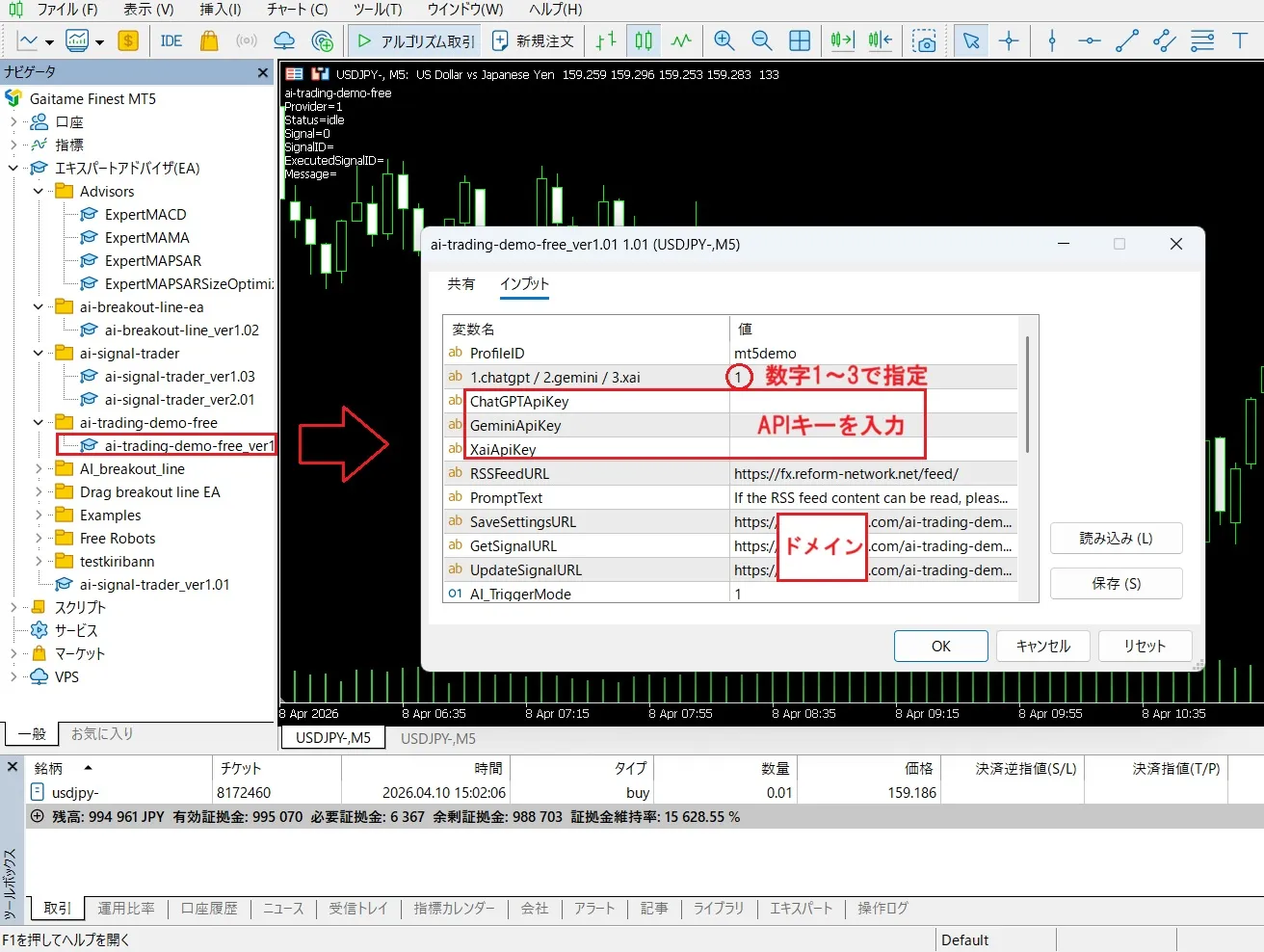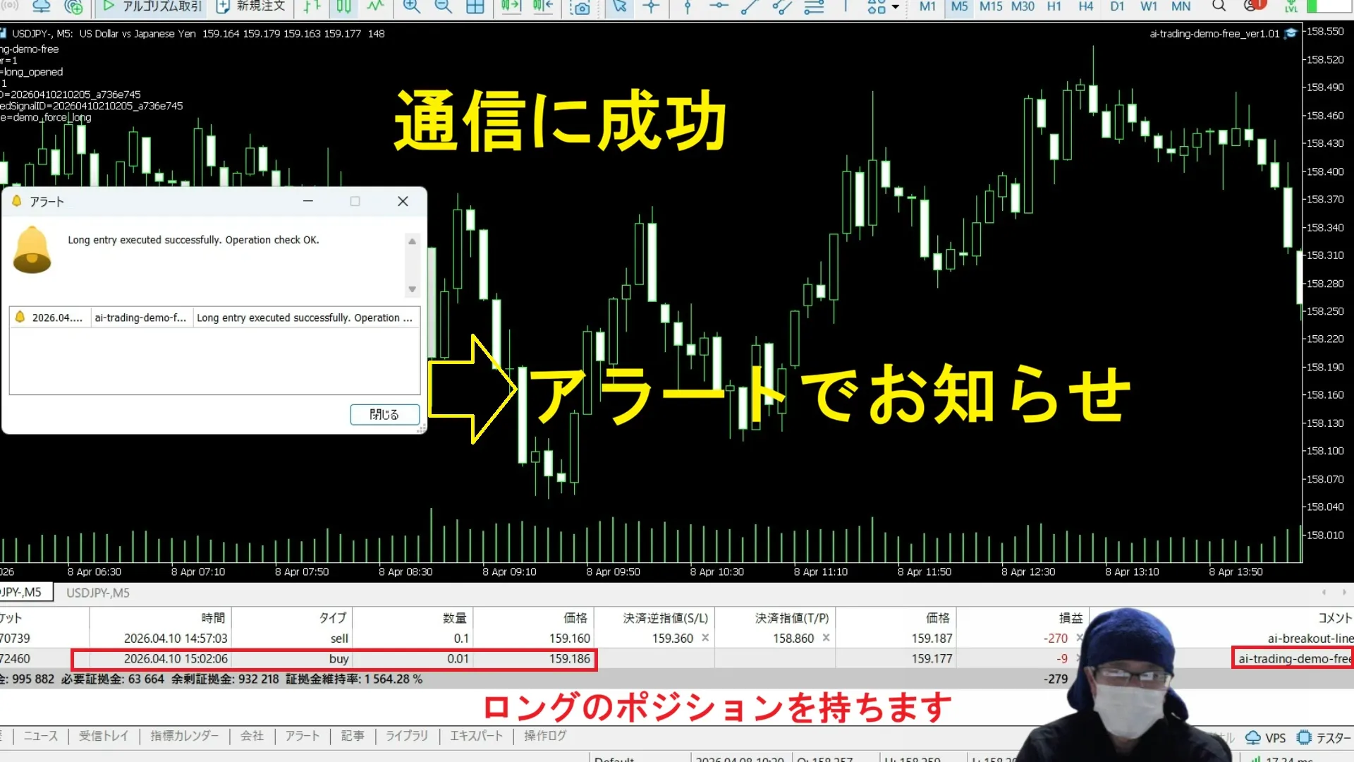 本デモ版は、AIとの連携が成功するとロングポジションを持つ仕様になっています。プロンプトを書き換えればAIに売買判定をさせることも可能ですが、システム全体を再構築するにはプログラミングの知識が必要になります。有料版では、PHPファイルを差し替えるだけでバージョンアップできる形を想定しています。まずは無料デモ版で、正常に動作するところまでぜひ実装してみてください。