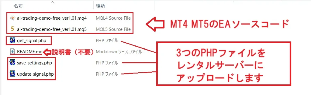 以下、ソースコードの全文です。MT4 MT5 PHPのコードをコピーして、パソコンに保存してください。