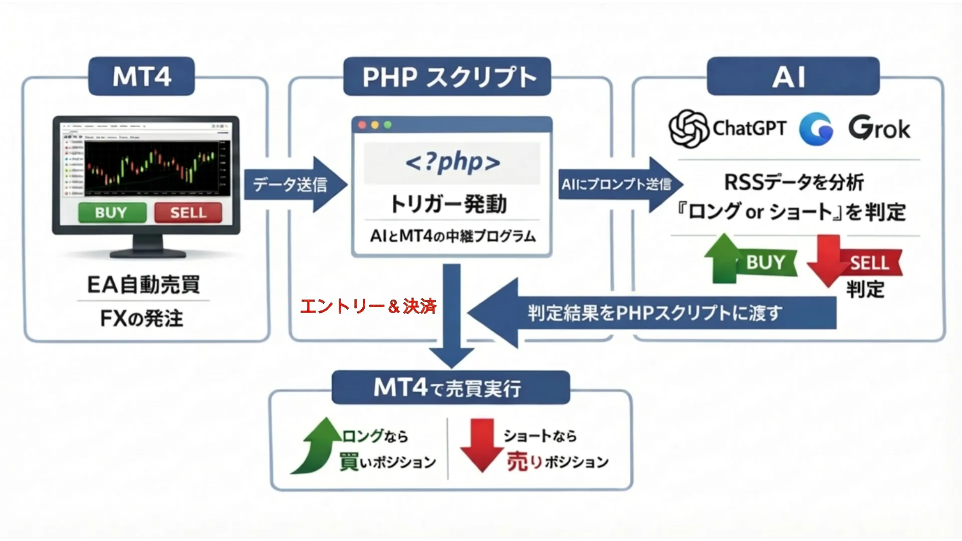 AIトレードは難しそうに見えますが、実際には通常のEA自動売買より少しハードルが高い程度です。MT4・MT5に加え、PHPが動くサーバーやAI用APIの基本知識は必要になりますが、自分でプログラムを書く必要はありません。これまでEAを動かしてきた方なら、十分に扱える範囲だと思います。