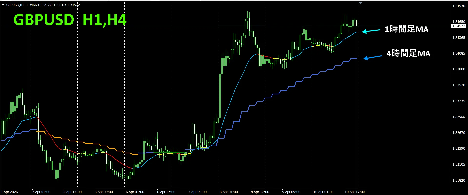 一例として、GBPUSDの1時間足チャートに、4時間足の移動平均線を同時に表示させてみました。ガタガタと階段状になっているのが、4時間足の移動平均線です。1時間足の移動平均線も、4時間足の移動平均線も、上昇時は青色系のカラーで、下降時は赤色系のカラーで表示されるので、カレントチャートのトレンド方向と、上位足のトレンド方向が、カラーで一目で判別できます。