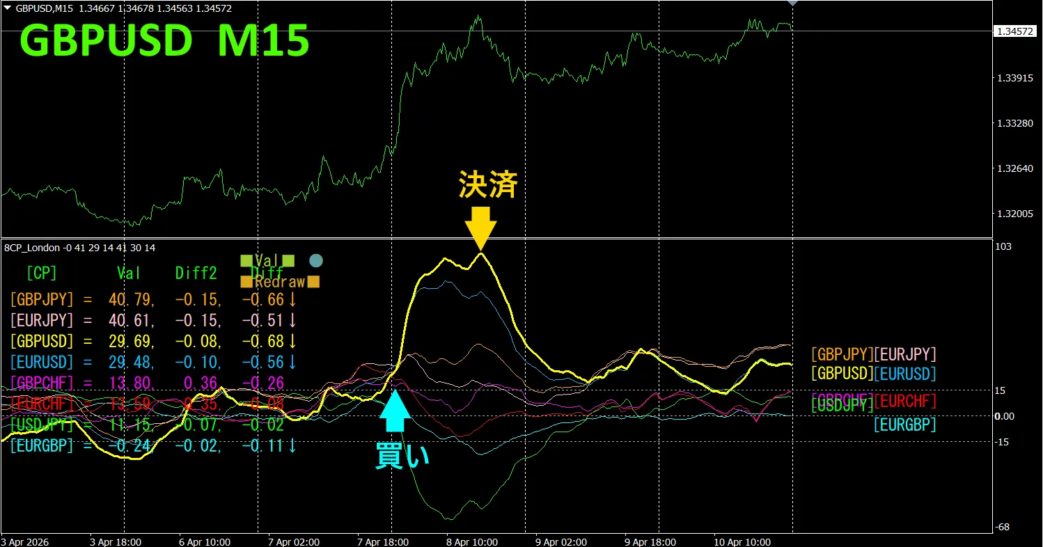上半分は、GBPUSDの15分足チャートです。下半分は、「8CP見える化インジケータ」によるものです、黄色のグラフがGBPUSDに相当します