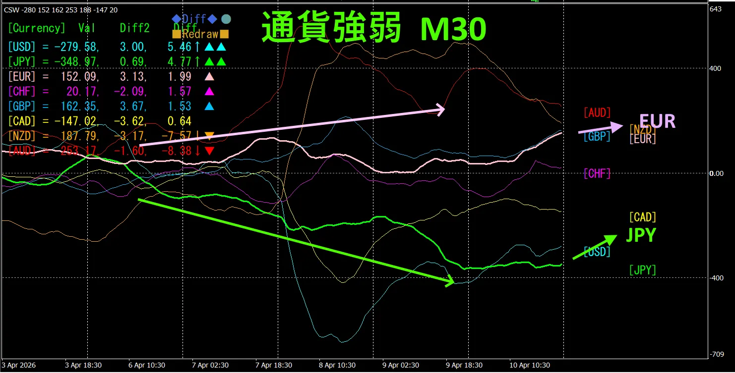 ピンク色がEUR、緑色がJPYです。通貨強弱チャートから、先週は、通貨EURが強く、通貨JPYが弱かったことが分かります。