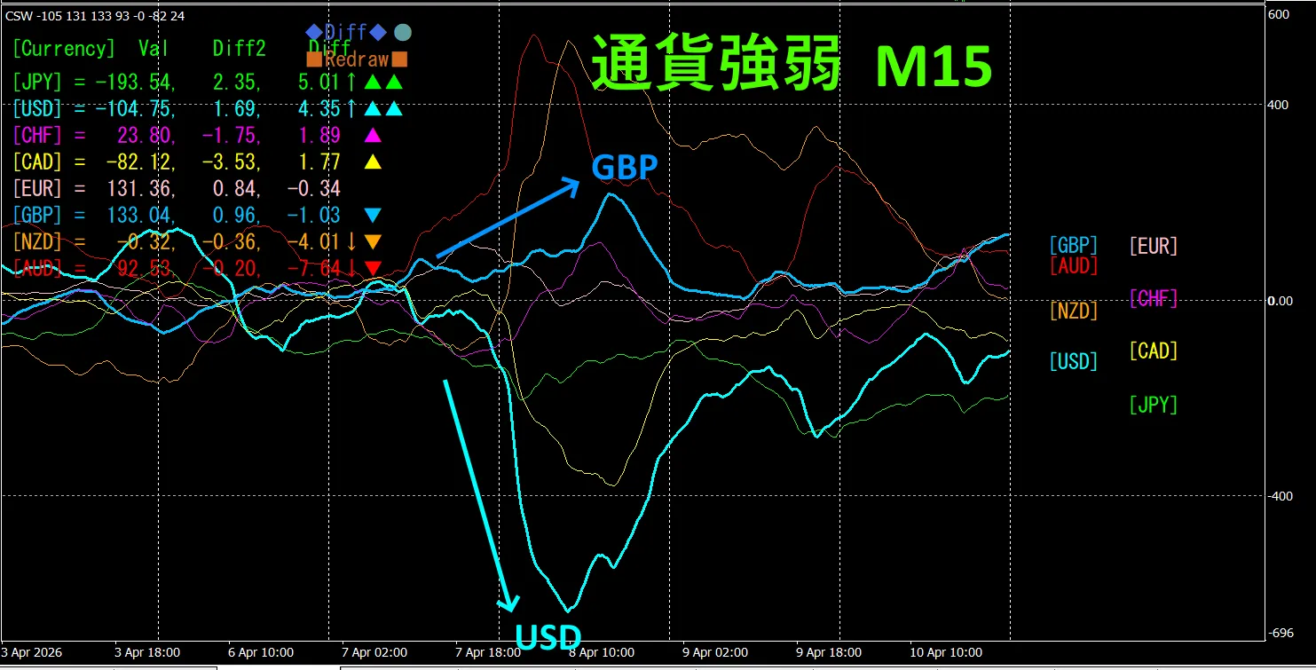 15分足の通貨強弱グラフを見ると、GBPとUSDが、逆相関関係になっていることがわかります。GBPとUSDが拡散して広がっている部分だけでトレードをします。拡散時にGBPUSDを買いでトレードすれば良いのです。短い時間ですが、逆相関関係のチャートになっているので、そのポイントだけ狙ってトレードします。