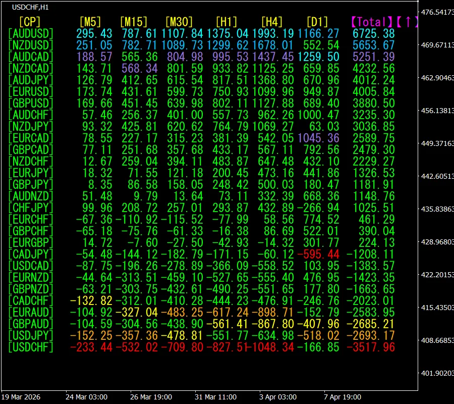 [Total]で数値の降順に並んでいます。一番上にあるAUDUSDは、全ての時間足で青色系の表示色になっています。しかも、Total数値が、6725.38で、極端に大きいプラスの数字になっています。AUDUSDに上昇トレンドが発生していることが示唆されます。