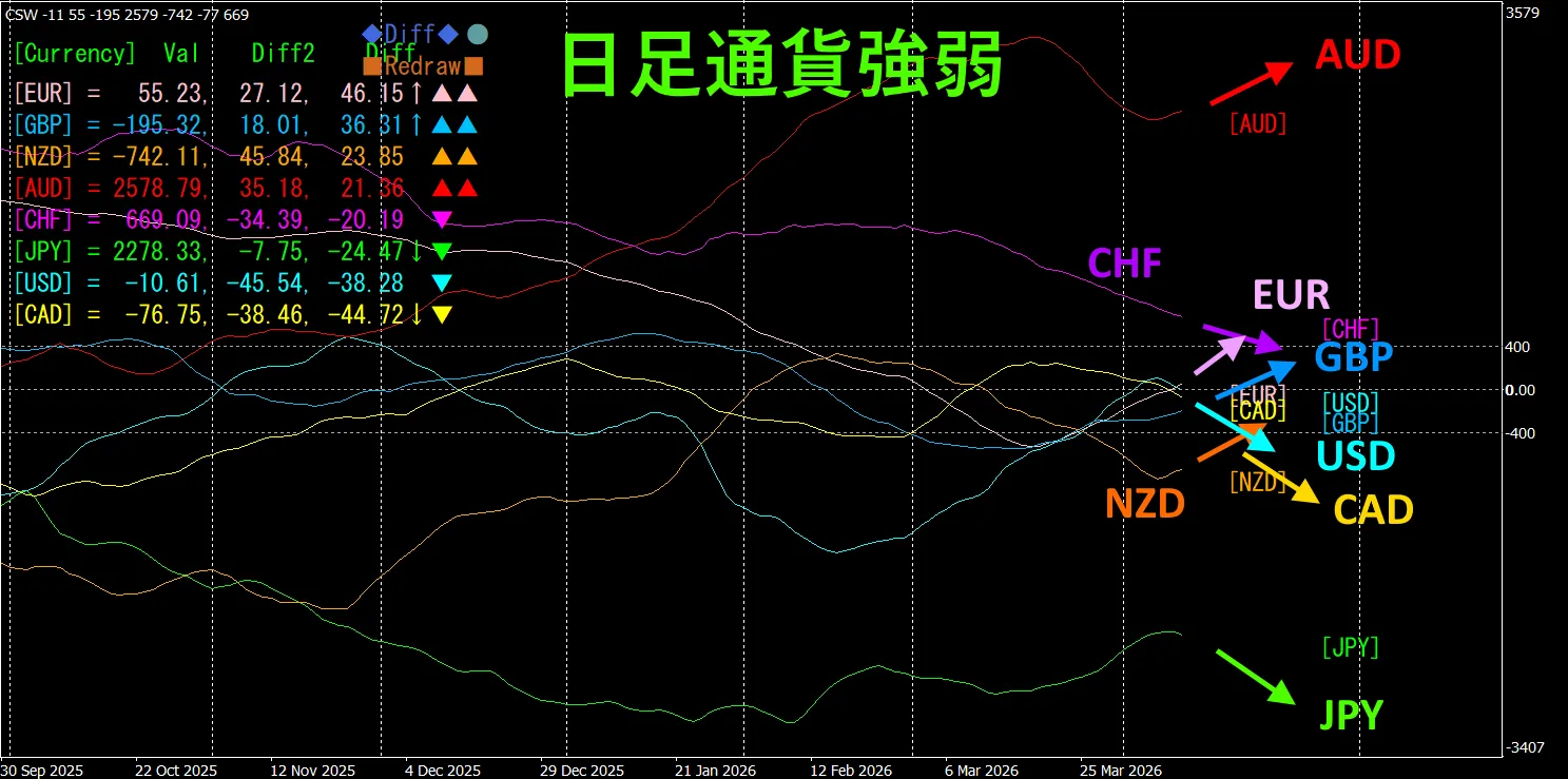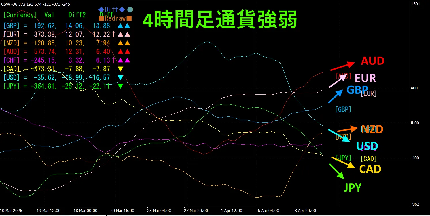 4時間足では、GBP、EUR、NZD、AUD、CHFが上向きに、JPY、USD、CADが下向きになっています。