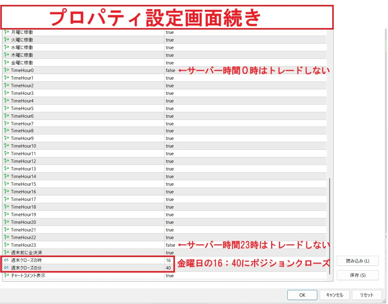本ツールでは、プロパティ設定からトレードする時間・しない時間を細かく設定可能です。