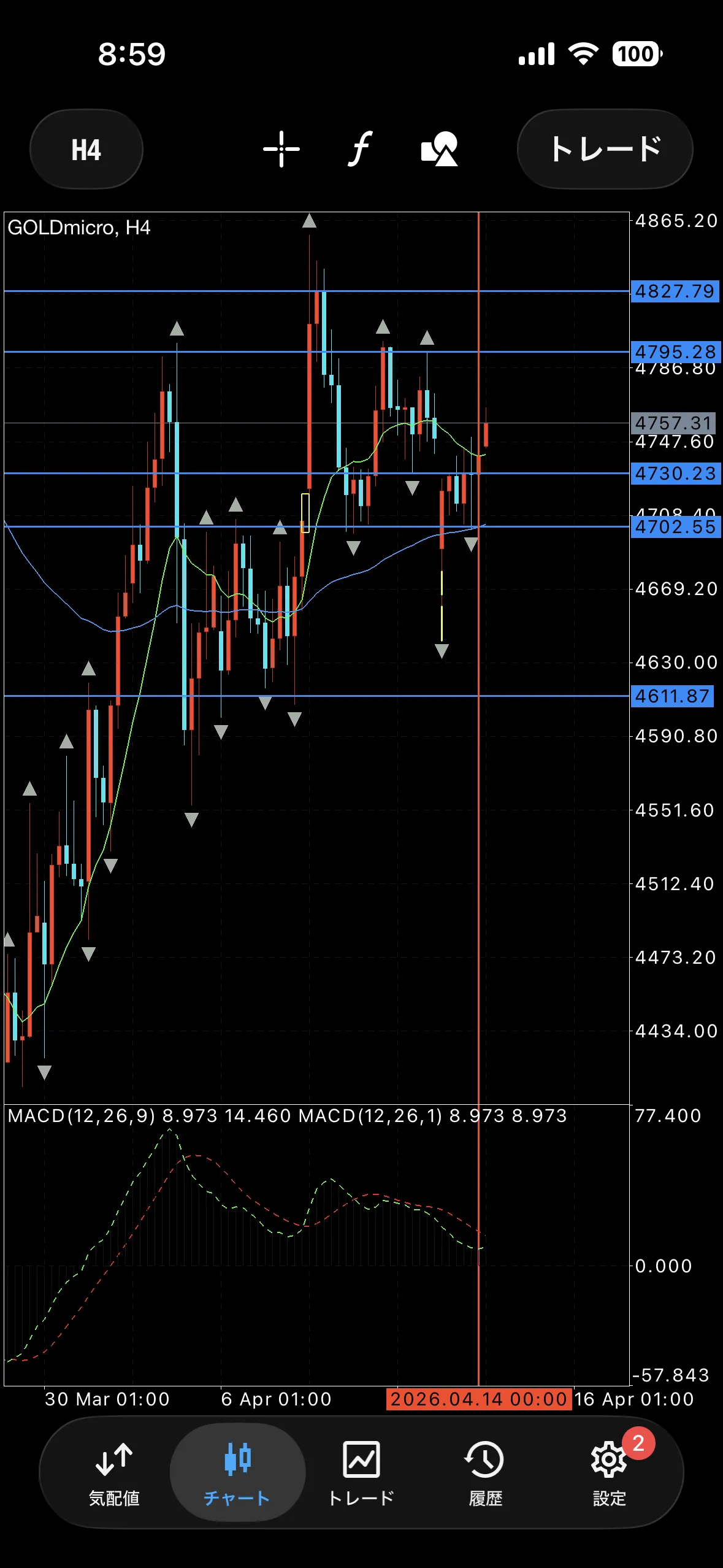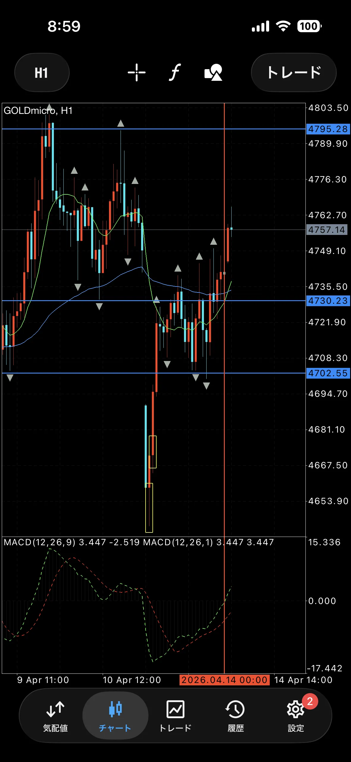 WTのネックラインを抜けてMACDもGCながら、右肩付近で上昇ストップ。