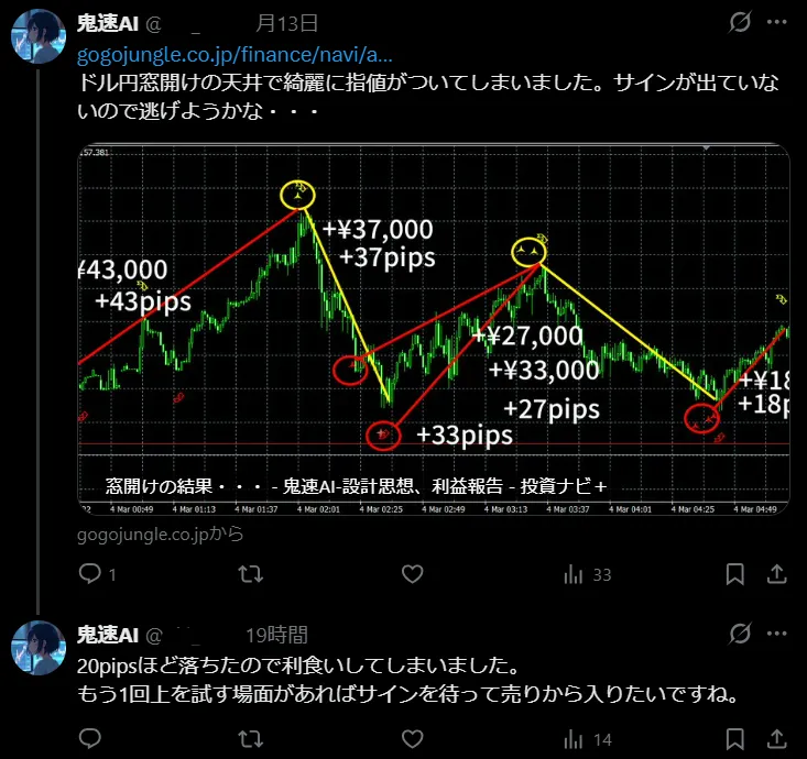 その後X(Twitter)では20pips下落後利食いと報告しました。