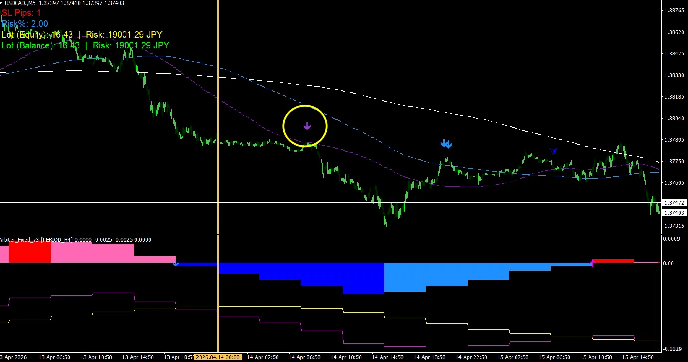 この時の【Arbiter】は強い下降トレンド状態を示唆する「濃い青色」の状態となっており、日足の状況を考慮するとエントリーの期待値としては良好と考えられます。