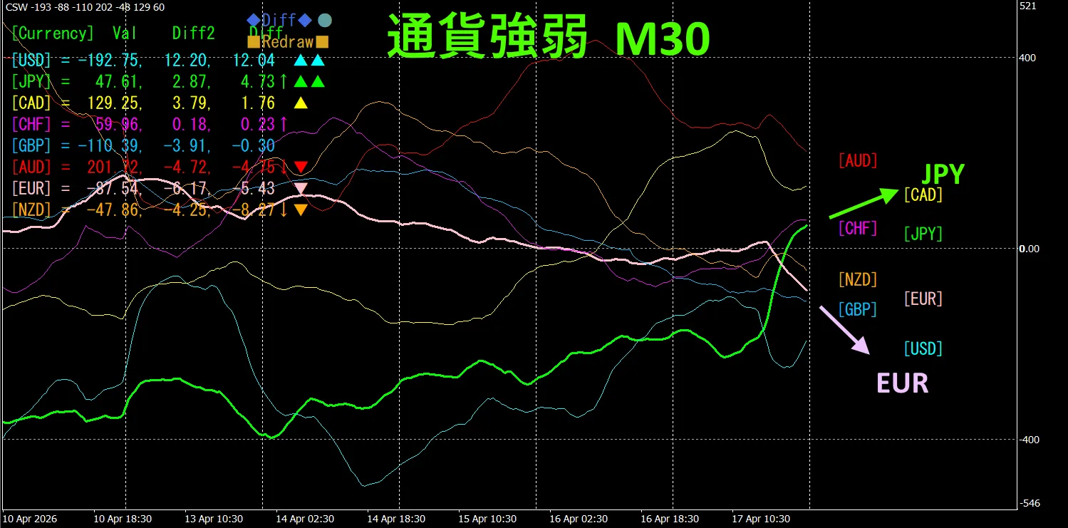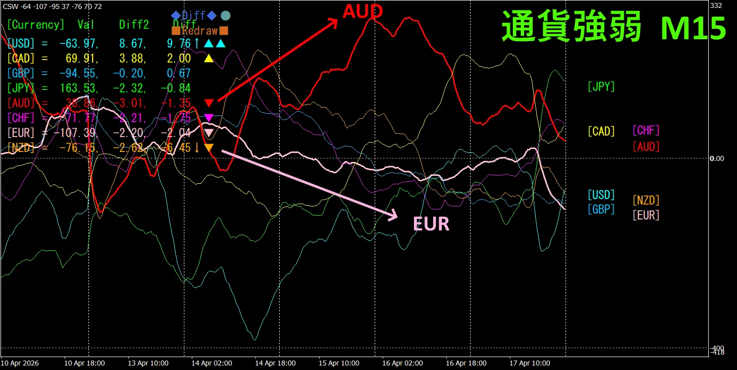 15分足の通貨強弱グラフを見ると、AUDとEURが、逆相関関係になっていることがわかります。AUDとEURが拡散して広がっている部分だけでトレードをします。拡散時にEURAUDを売りでトレードすれば良いのです。逆相関関係になっているので、そのポイントだけ狙ってトレードします。